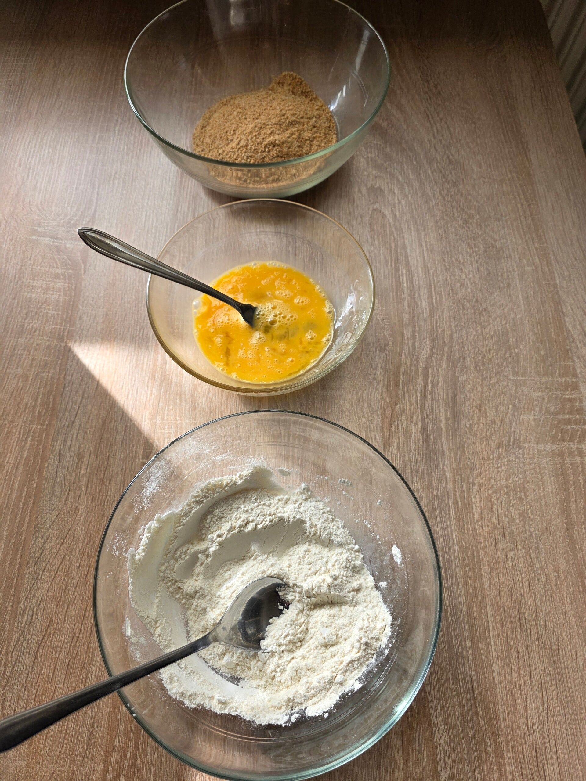 Mix two parts of flour with a part of corn starch in a bowl. Beat the eggs in a second bowl. Put the breadcrumbs in a third bowl.